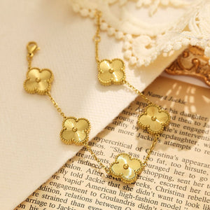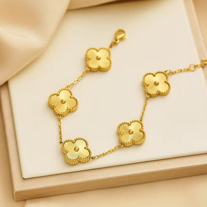 An elegant bracelet with five black cloverleaf elements, framed by delicate gold details. A symbol of luck and elegance, a true eye-catcher for any occasion. 18K gold-plated stainless steel. Decorated with black cloverleaf elements. Nickel-free and suitable for allergy sufferers. Tarnish-free and water-resistant. Length: approx. 20 cm.