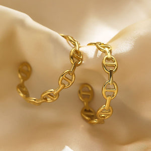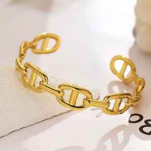 A powerful bangle with striking links and a highly polished surface. A statement piece for confident looks. 18K gold-plated stainless steel. Nickel-free and allergy-friendly. Tarnish-free and water-resistant. One size fits most wrists.