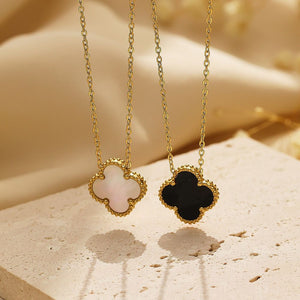 Timeless necklace with a delicate clover-leaf pendant in black or mother-of-pearl, a symbol of luck and elegance. Stainless steel, 18K gold-plated Nickel-free & water-resistant Allergy-friendly.