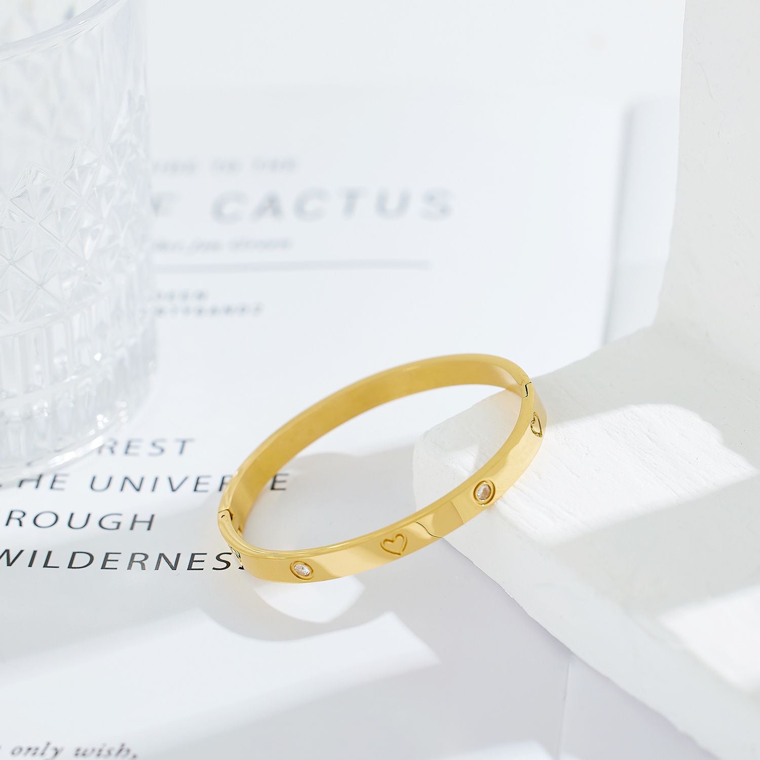 Ein raffinierter Armreif mit feinen Herzgravuren und funkelnden Zirkonia-Details, ein Symbol für Liebe und Eleganz. Erhältlich in Gold, Silber und Roségold. 18 Karat vergoldeter Edelstahl. Mit Herzgravuren und Zirkonia-Elementen. Nickelfrei und für Allergiker geeignet. Anlaufgeschützt und wasserfest. Einheitsgröße, passend für die meisten Handgelenke.