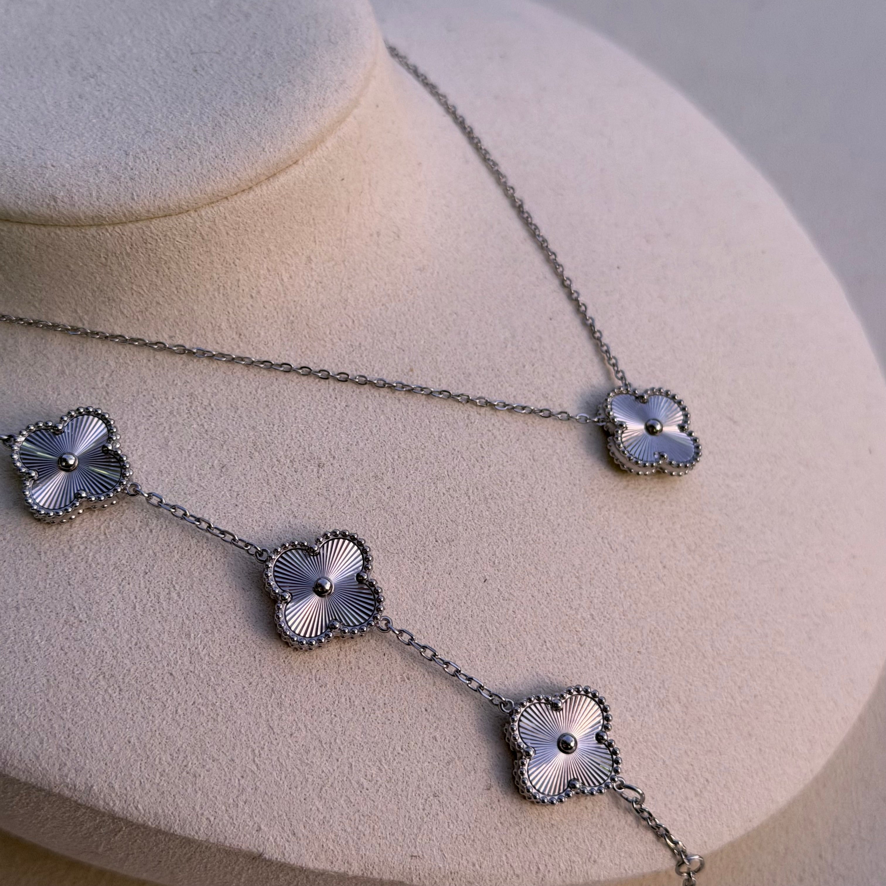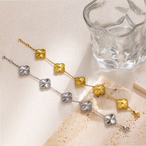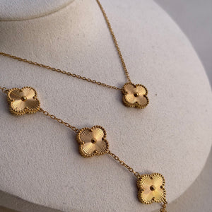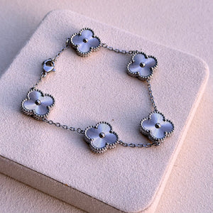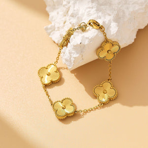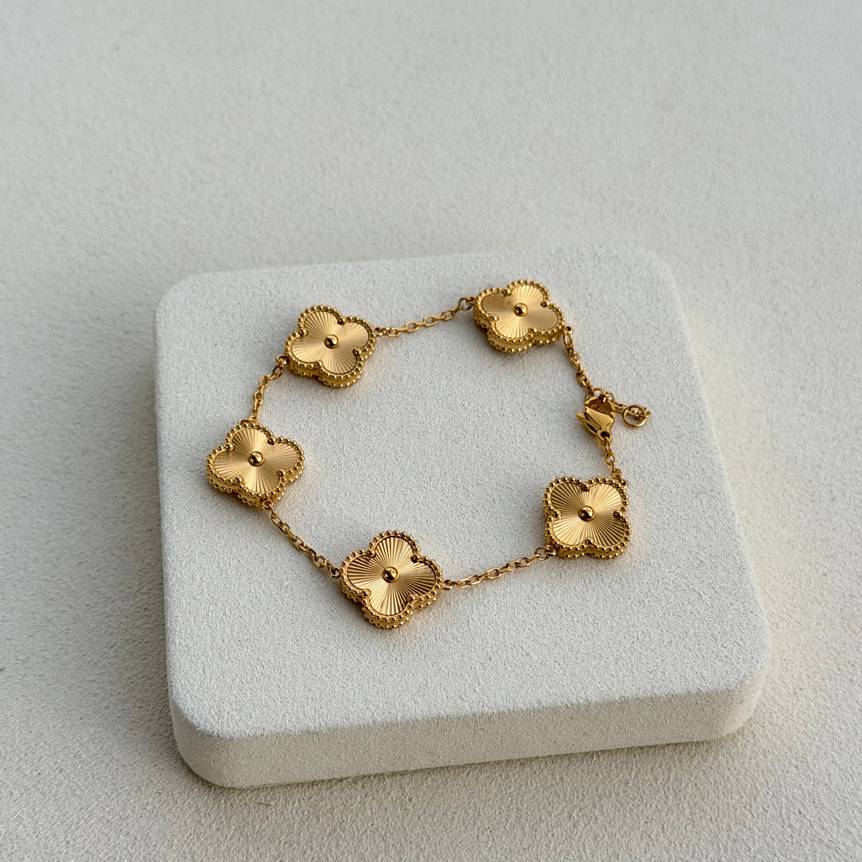 Ein elegantes Armband mit fünf schwarzen Kleeblatt-Elementen, umrahmt von zarten Golddetails. Ein Symbol für Glück und Eleganz, ein echter Hingucker für jeden Anlass. Edelstahl 18 Karat vergoldet. Verziert mit schwarzen Kleeblatt-Elementen. Nickelfrei und für Allergiker geeignet. Anlaufgeschützt und wasserbeständig. Länge: ca. 20 cm.