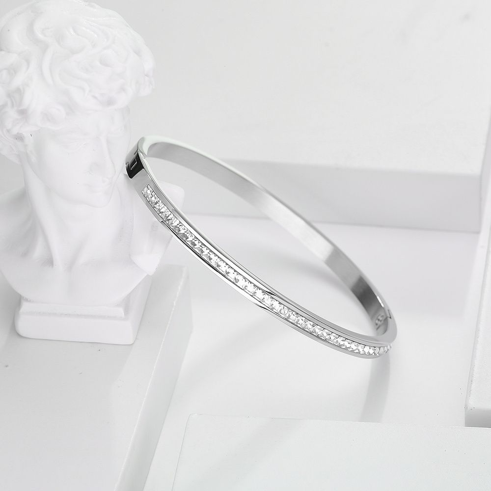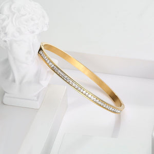 Ein zarter Armreif, verziert mit einer feinen Reihe funkelnder Zirkonia, minimalistisch und doch luxuriös. Erhältlich in Gold und Silber. 18 Karat vergoldeter Edelstahl Feine Zirkonia-Reihe für einen eleganten Glanz Nickelfrei & für Allergiker geeignet Anlauffrei & wasserfest Einheitsgröße, passend für die meisten Handgelenke