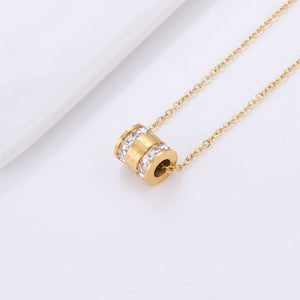 Eine elegante Halskette mit einem funkelnden Zylinderanhänger, verziert mit klaren Kristallen, stilvoll und zeitlos zugleich. Edelstahl, 18 Karat vergoldet. Nickelfrei und wasserfest. Allergikerfreundlich.